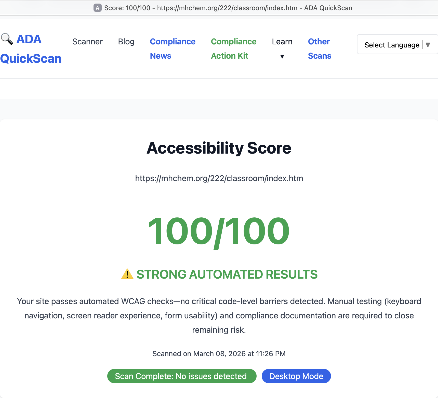 The following graphics show the accessibility approval granted after testing with the ADA QuickScan website: